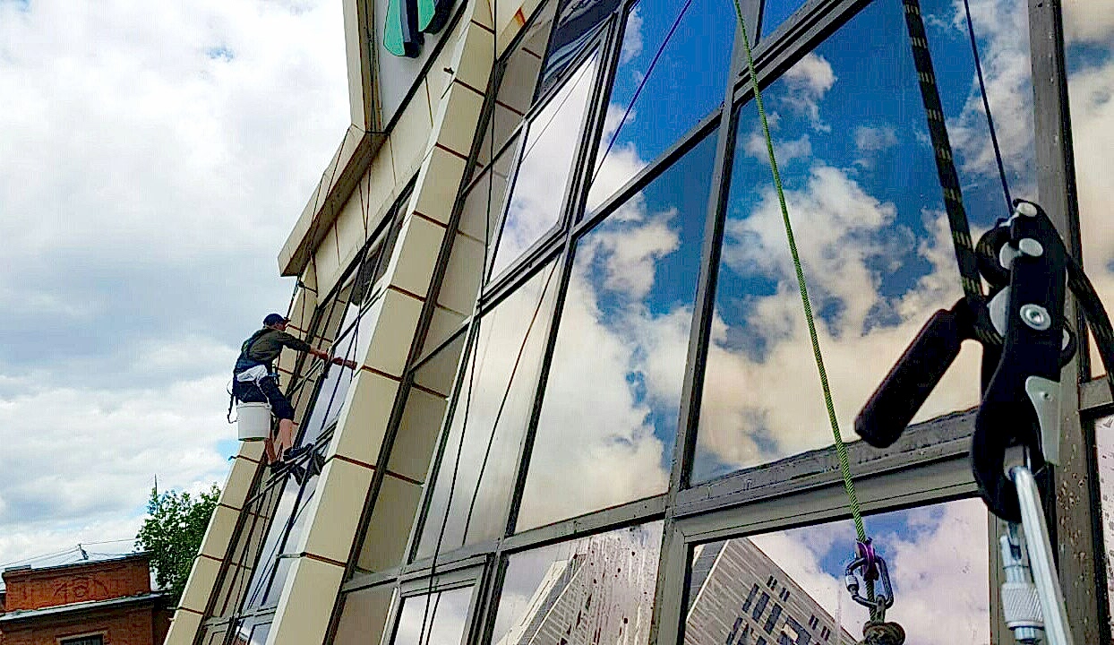 Наши альпинисты очищают отремонтированные фасады зданий и окна с помощью широкого спектра современных Pin-Up средств.
